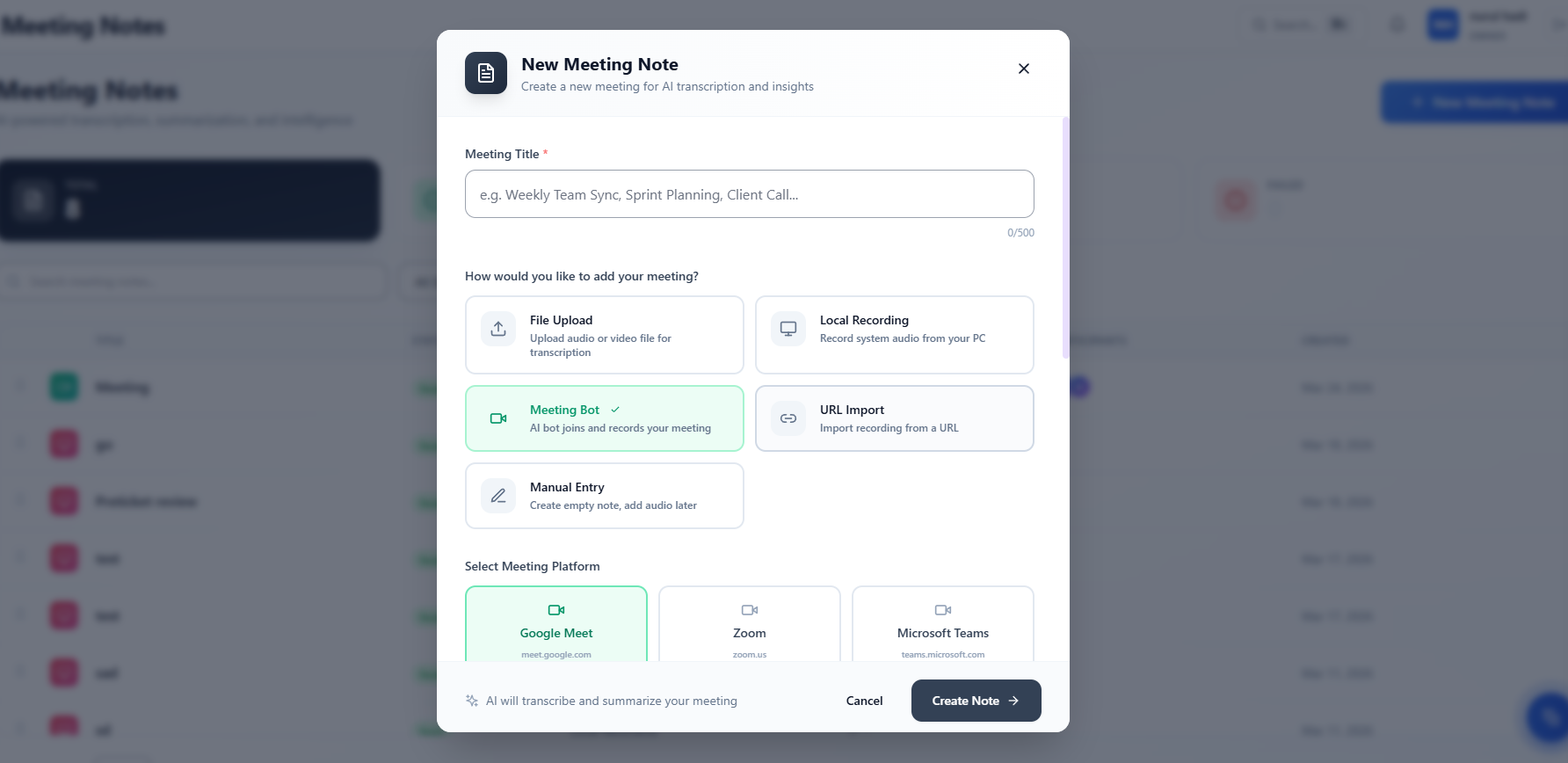 AI-powered meeting transcription with automatic summaries and action items extraction